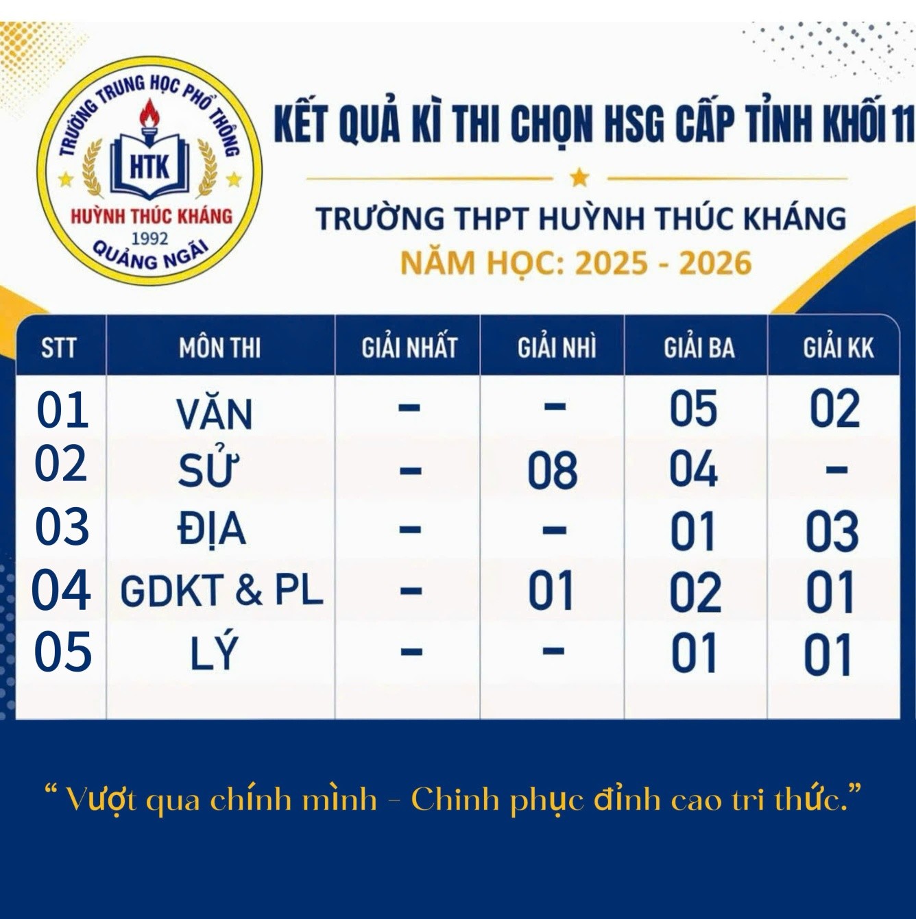 Nhà trường nồng nhiệt chúc mừng đội tuyển học sinh giỏi lớp 11 đã xác lập thành tích cao tại Kỳ thi chọn HSG cấp tỉnh năm học 2025–2026 với 29 giải thưởng trên tổng số 36 học sinh dự thi, đạt tỉ lệ 80.5%. Vị thứ 15/61 Trường tham gia.